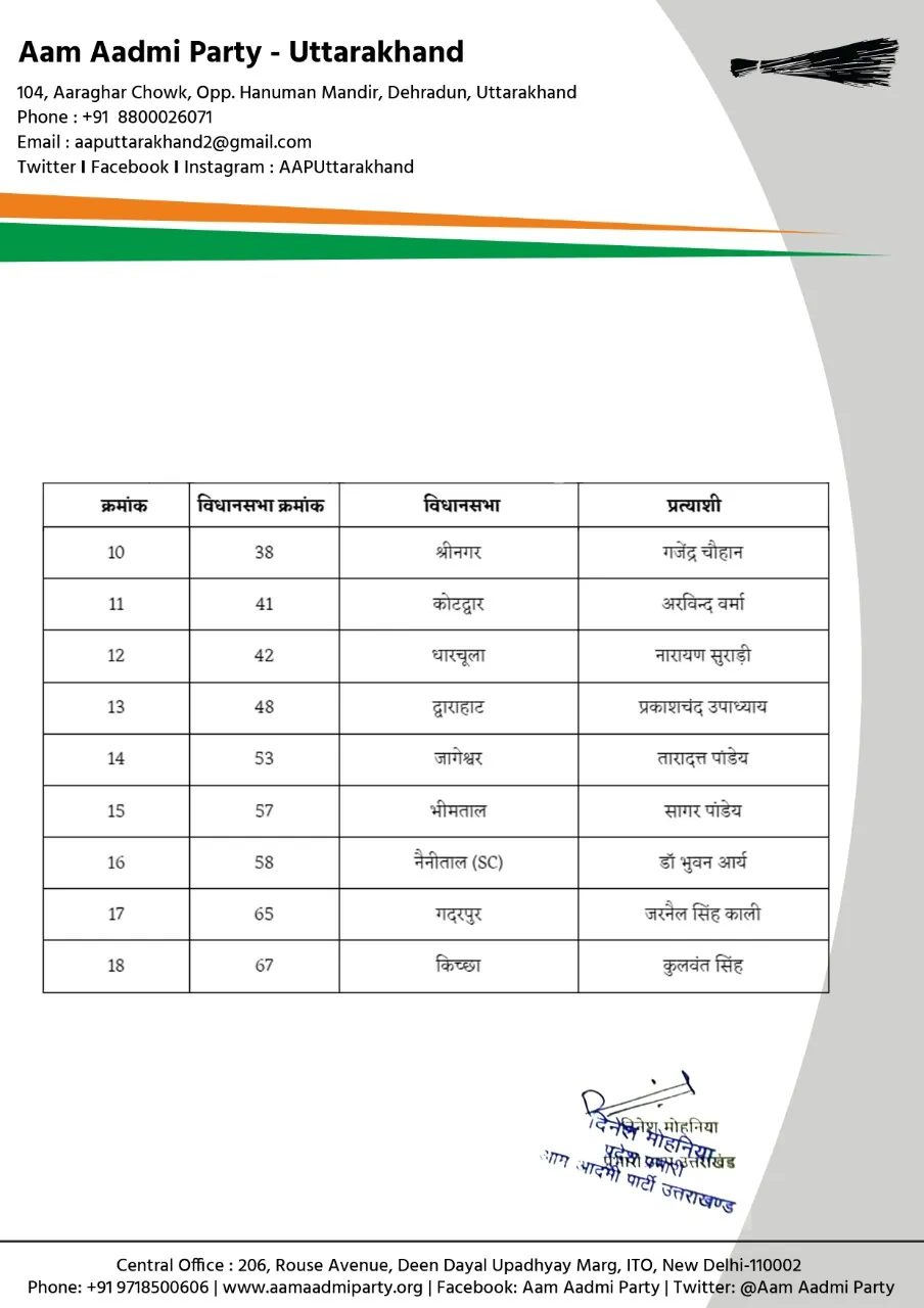 उन्होंने बताया कि आप की दूसरी लिस्ट में 11 प्रत्याशी गढवाल से और सात प्रत्याशी कुंमाउ से फाईनल किए गए हैं।
